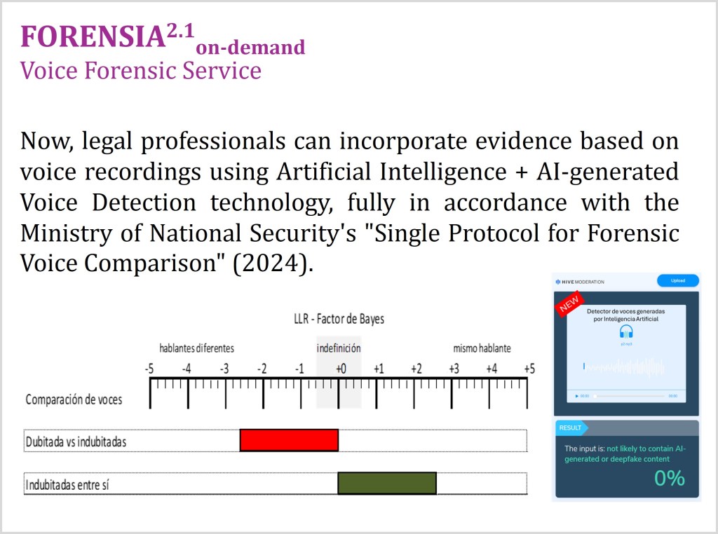 The FORENSIA system of forensic identification of speakers was presented at the First National Symposium on «Science and Justice» organized by CONICET in December 2016 and has been used in the «Candela» case to collate voices. Since 2019, he has been employed by the Voice Collation Section of the Expert Advisory of the Judicial Power of the Province of Buenos Aires.